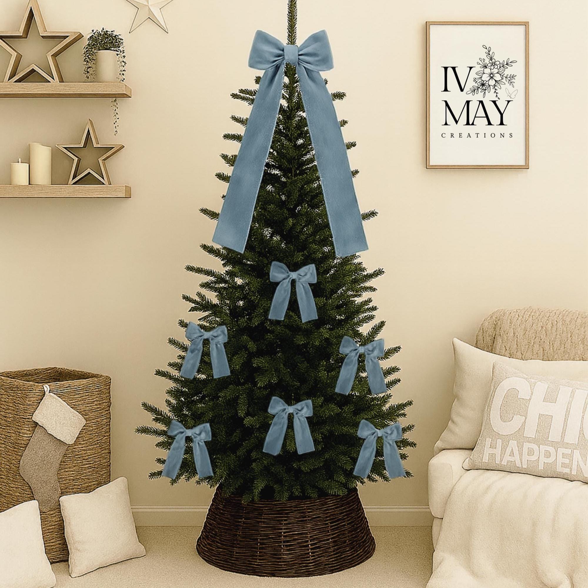 Luxury Handmade Velvet Christmas Tree Bow Topper: Clip-On Holiday Decor - Dusty Blue - Pale Blue