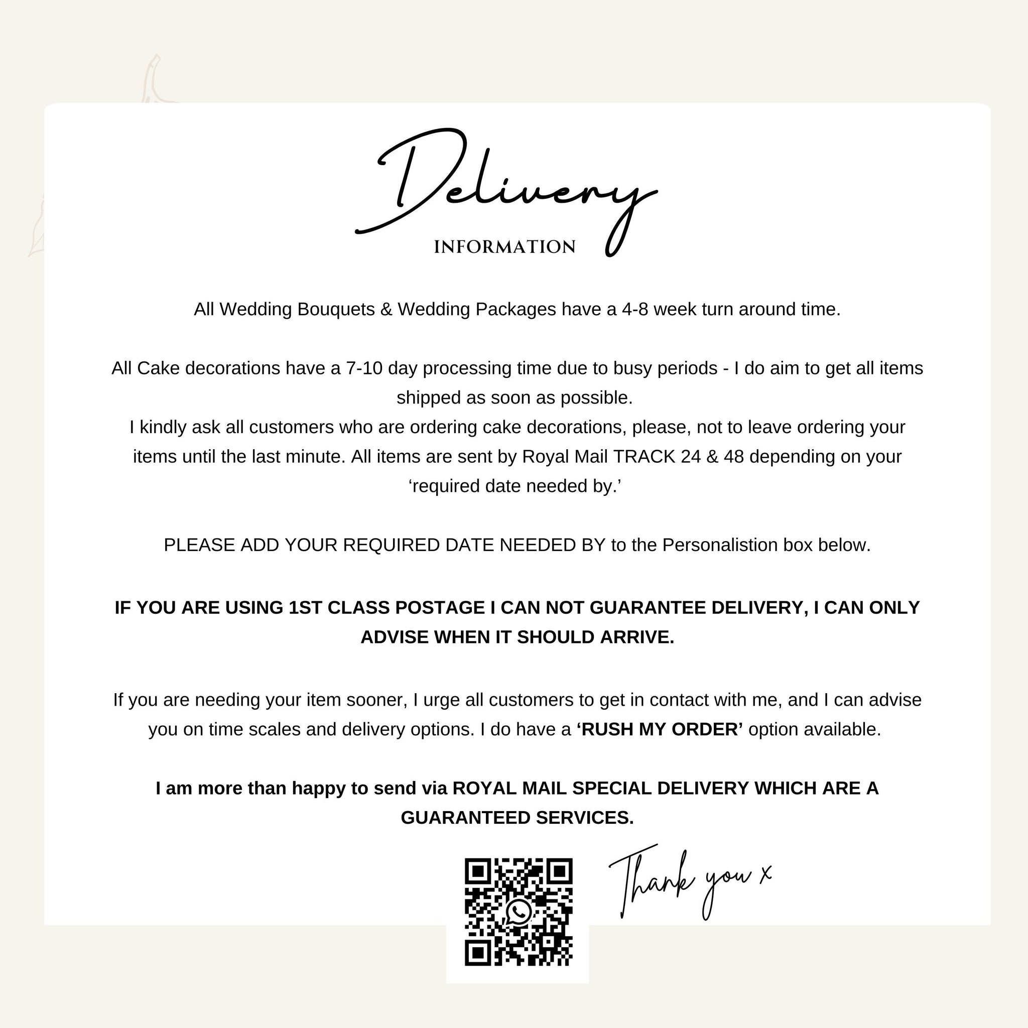 All items that are purchased have a 7-10 days processing time, due to busy periods, but I do aim to get all items shipped as soon as possible. I kindly ask all customers who are ordering cake decorations, please, not to leave ordering your items until the last minute, when selecting the Royal Mail 1st class postage option. 1st class is 1-2 days delivery but is not a guaranteed service.